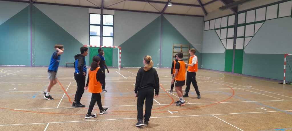 Eleana, Farah, Sylvain, Hamit, Enzo, Mandoumbé, Ramazan, Amir ont été bien accueillis par les élèves. Quelques exercices de passes, des jeux de ballon en échauffement, et nous avons pu organiser un petit tournoi avec 4 équipes.