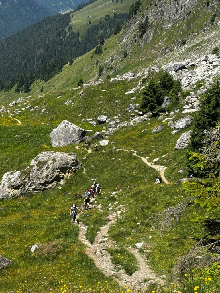 Le départ a été donné au parking de l’Erigné, à Morzine. Très vite, le groupe s’est engagé dans la magnifique vallée de la Manche, longeant le lac des Mines d’Or, avant d’entamer la montée vers le Col de Cou, frontière naturelle entre la France et la Suisse. Sous un ciel clément, les élèves ont poursuivi leur effort jusqu’au col de la Golèse, pour enfin atteindre le refuge de Bostan vers 17h30. Une première journée exigeante mais magnifique, ponctuée de panoramas superbes et de belles découvertes.