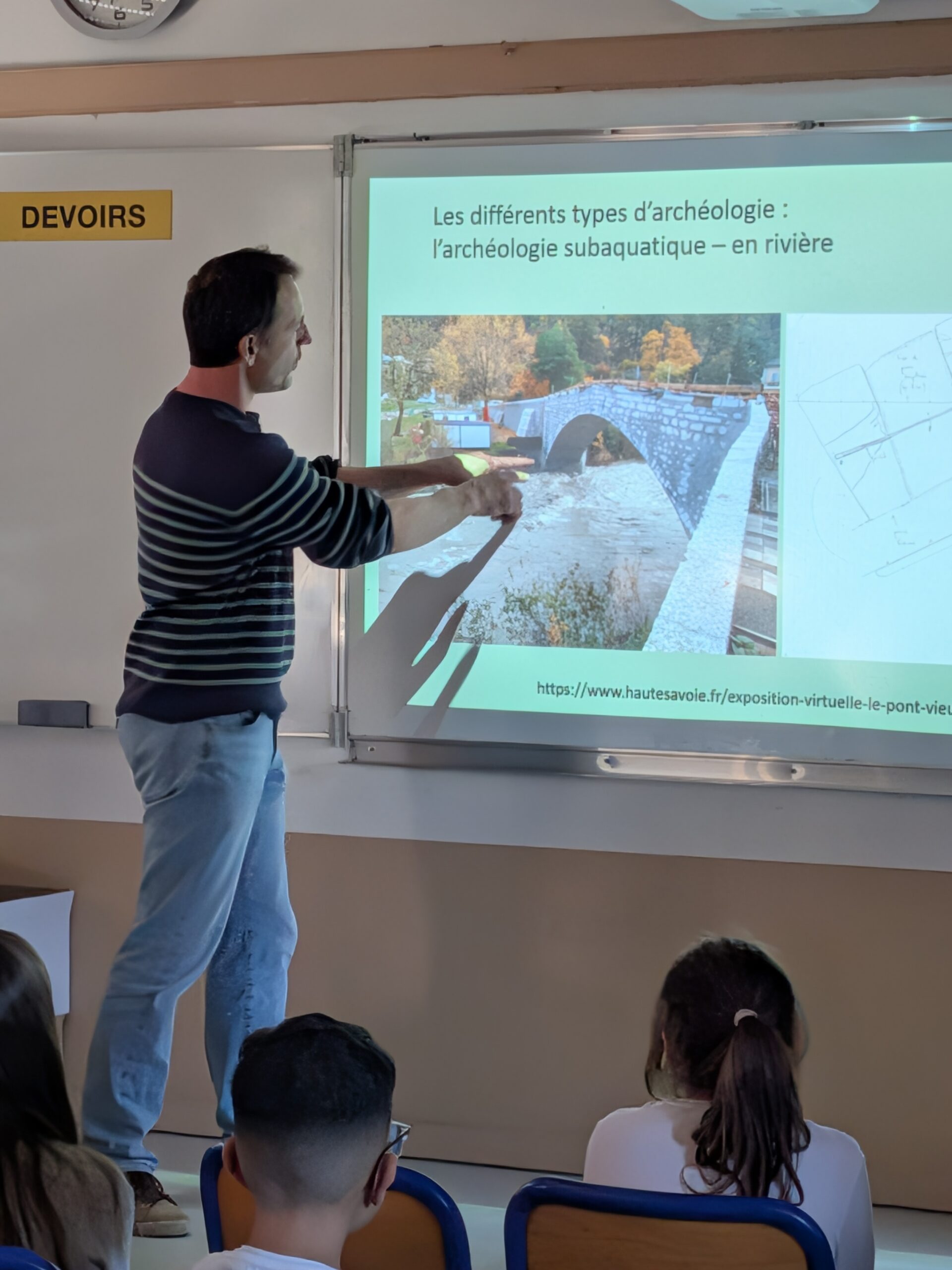 L’intervention s’est poursuivie par la présentation de photographies de chantiers de fouille réalisés en Haute-Savoie. Ces supports ont permis aux élèves de se familiariser avec les techniques archéologiques et les conditions réelles de travail sur le terrain.