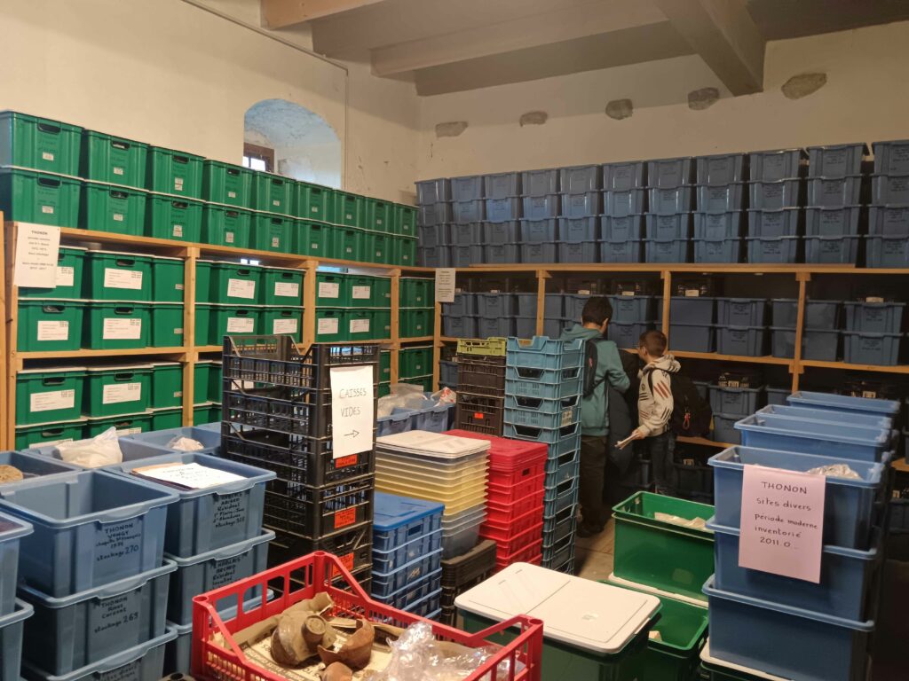 e temps d’une après-midi le 23 novembre dernier, les 6A sont partis à la découverte des réserves archéologiques du musée de la ville de Thonon-les-Bains : céramiques reconstituées, ossements humains, anciennes pierres, meules ou encore amphores ont accueilli nos élèves au sein d’un lieu atypique situé au bord du lac et renfermant des décors muraux. Ils ont ainsi eu le privilège d’accéder à un lieu traditionnellement fermé au public afin d’observer l’organisation d’une réserve et la conservation des objets.