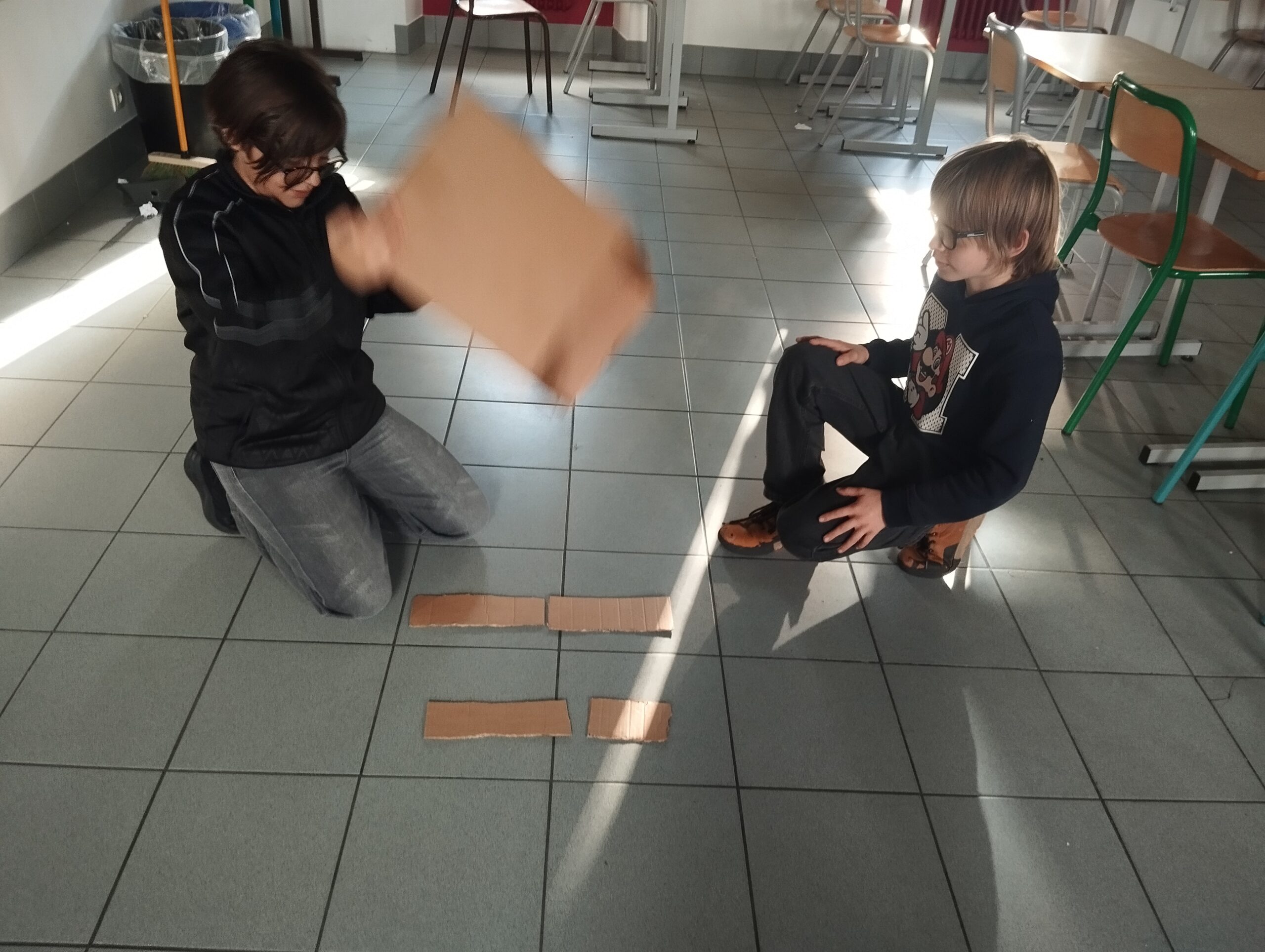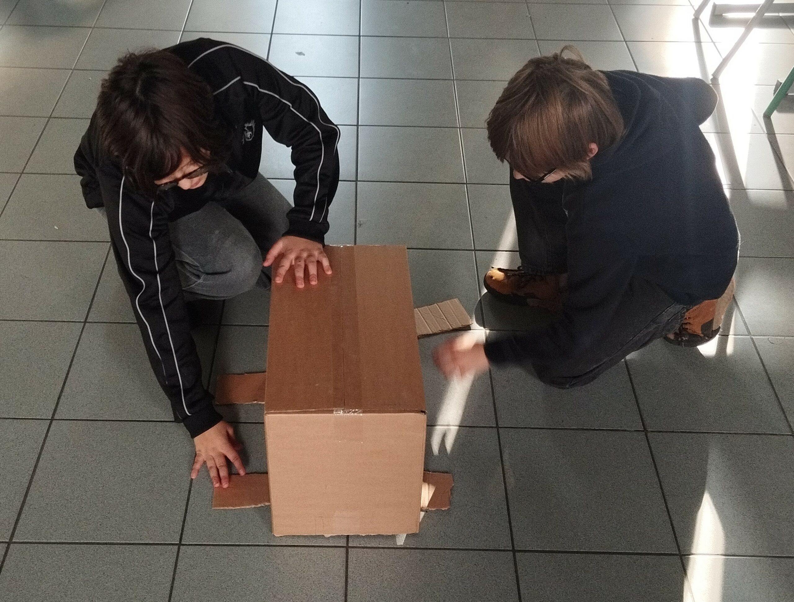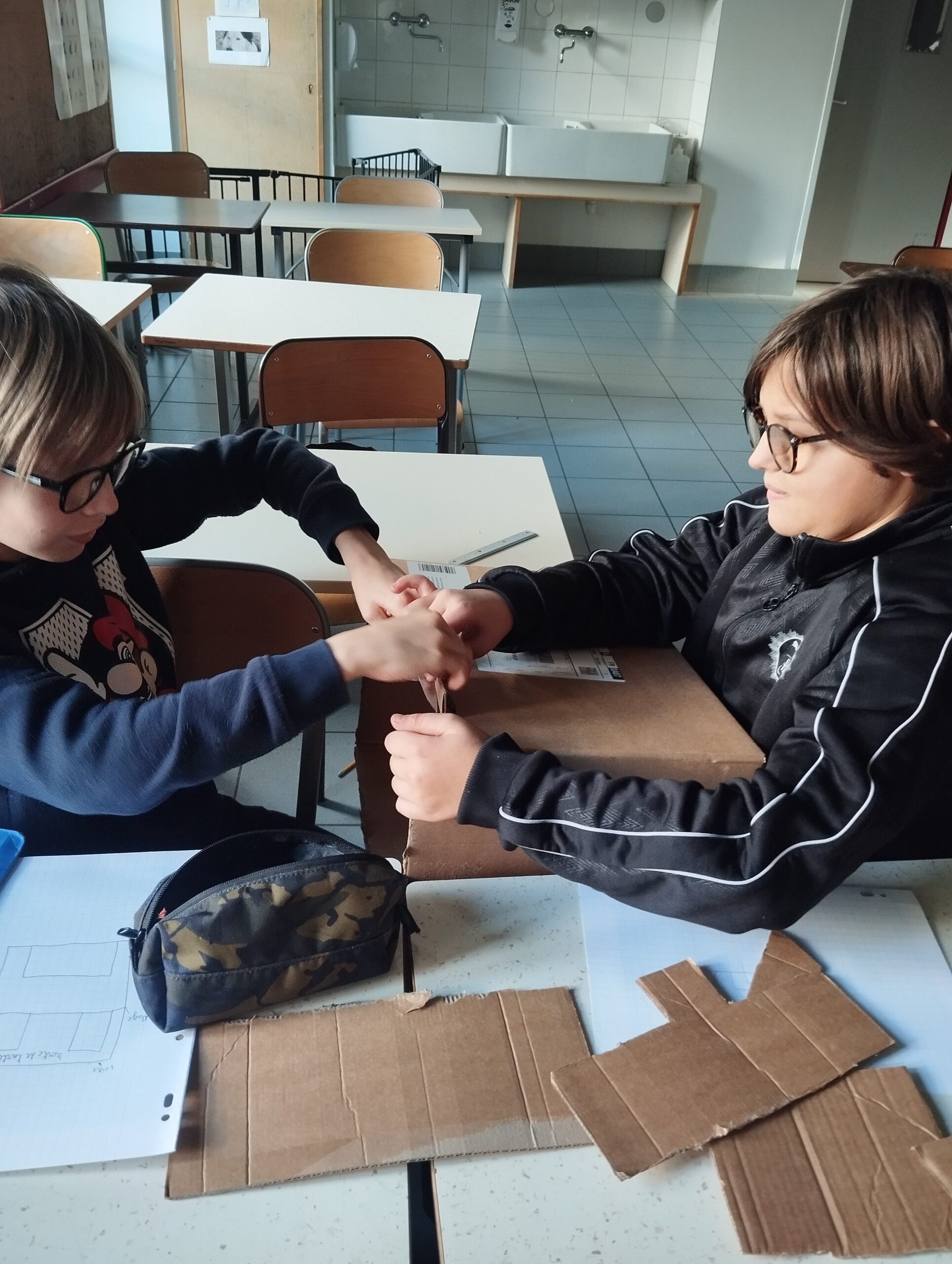 Armés d’un schéma, d’une paire de ciseaux et d’une bonne dose de travail d’équipe, nos 2 élèves ont conçu un jeu original dans lequel Tartif devait tirer sur des languettes pour récupérer des friandises habilement dissimulées.