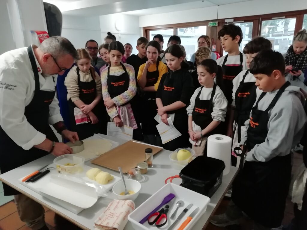 Encadrés par leur enseignante Mme Fara et par Jérôme GASSER, parent d’élève et pâtissier de métier, les élèves ont réalisé pas à pas une recette transmise par Mr Gasser deux ans plus tôt à Mme Fara : la tarte fine aux pommes.