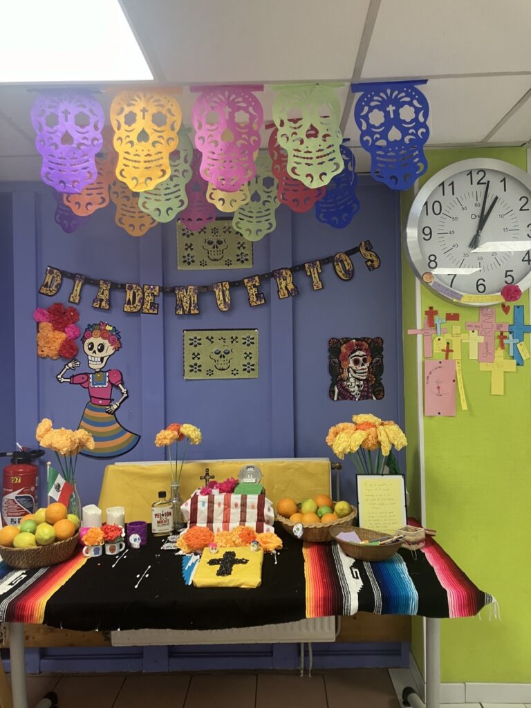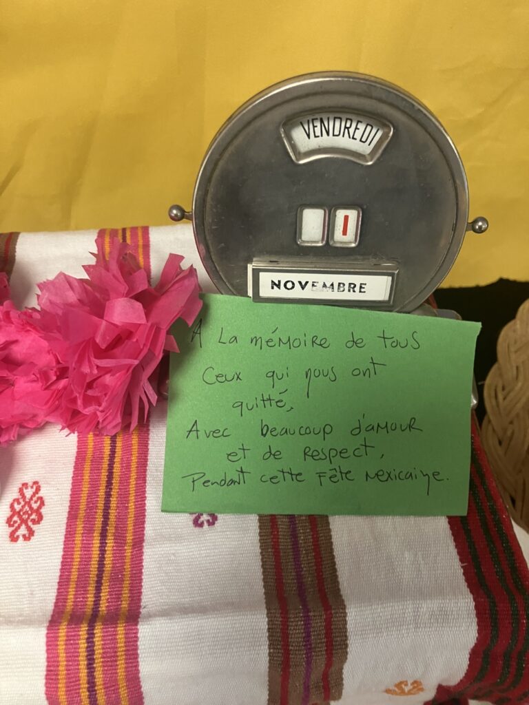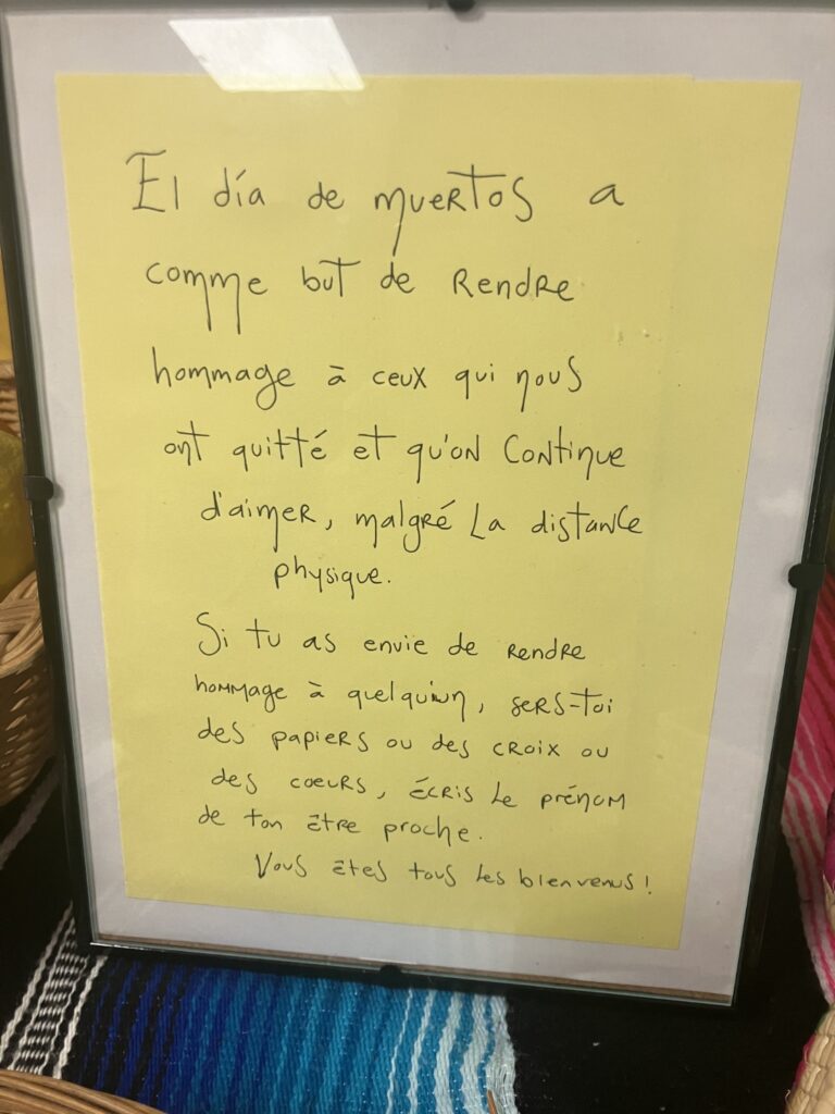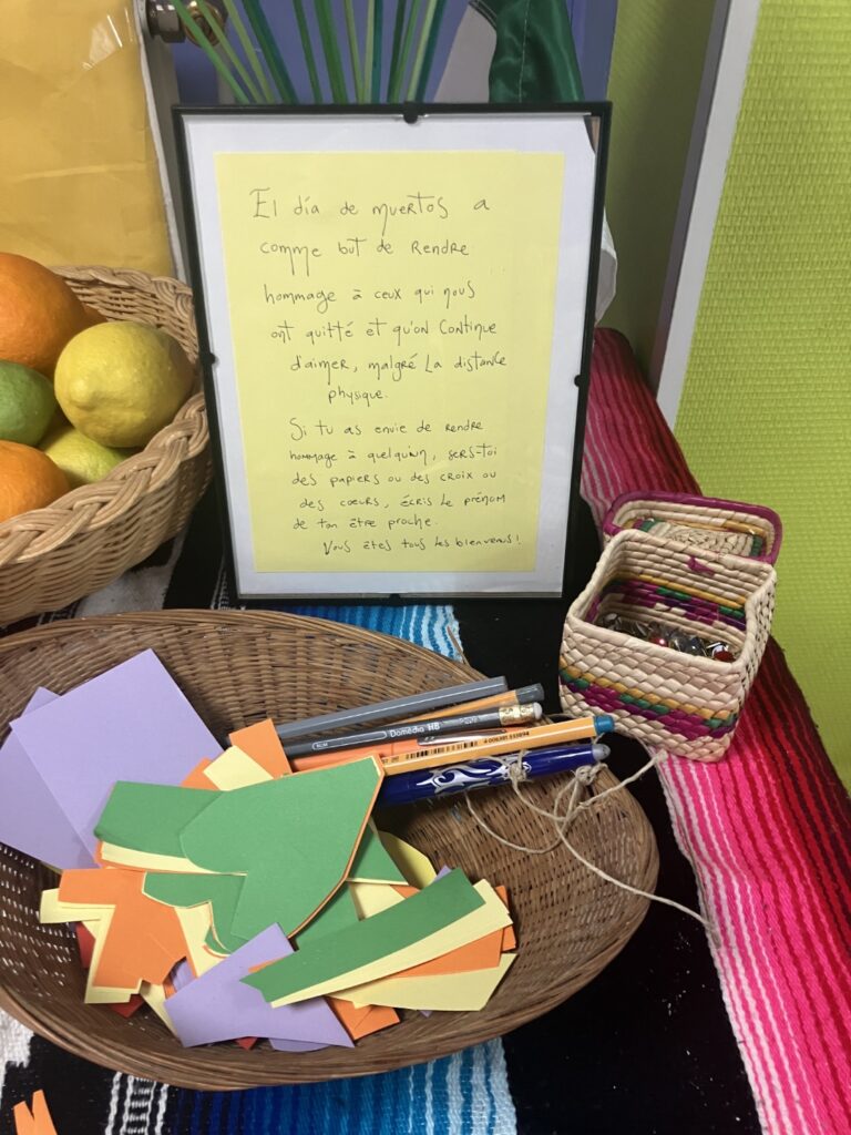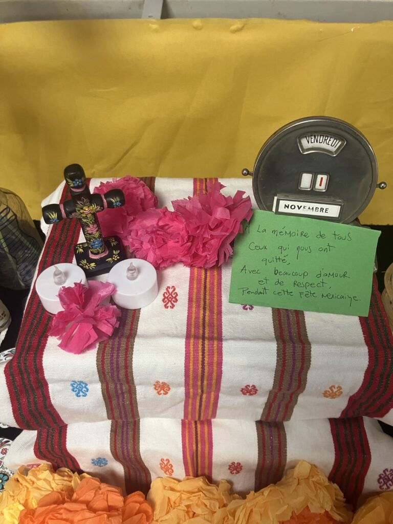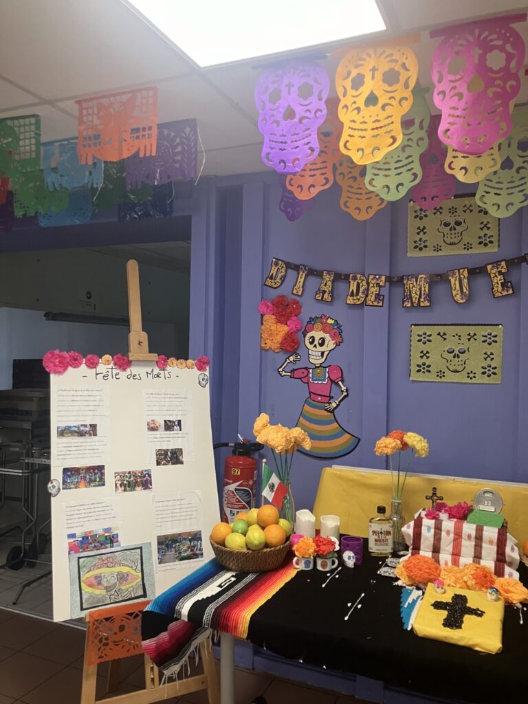 Jeudi 24 octobre, une offrande mexicaine a été montée dans le restaurant scolaire du collège. Les élèves ayant suivi le stage d’anglais des vacances de la Toussaint ont participé à cette activité de montage, qui s’est déroulée entièrement en anglais, permettant ainsi de continuer l’apprentissage en dehors de la salle de classe. Ils ont également réalisé une exposition à découvrir jusqu’au 8 novembre !