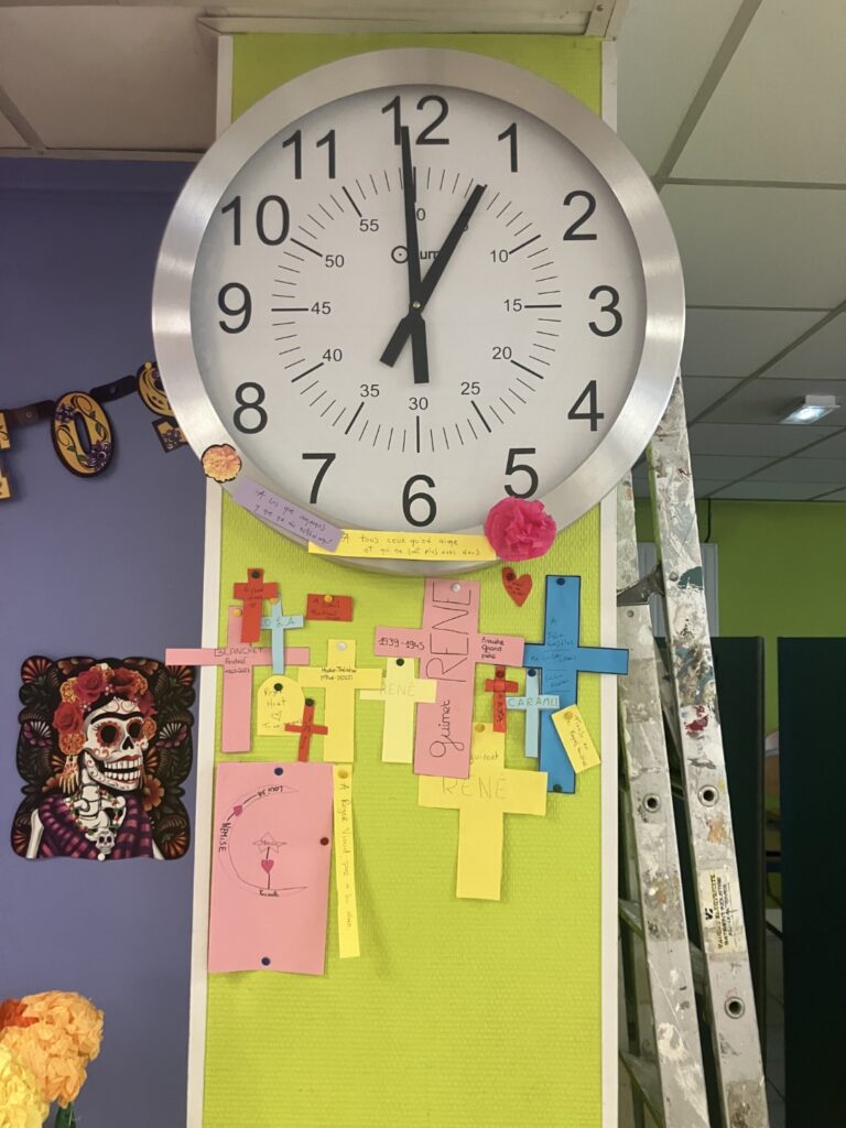 Jusqu’au 8 novembre, chaque élève, membre du personnel et enseignant est invité à accrocher une étiquette portant le nom d’un membre de sa famille, d’un ami ou même d’un animal de compagnie décédé. Peu importe la croyance ou la foi, tout le monde est invité et le bienvenu, le but étant de partager une pensée pour ceux qui nous ont quittés.
