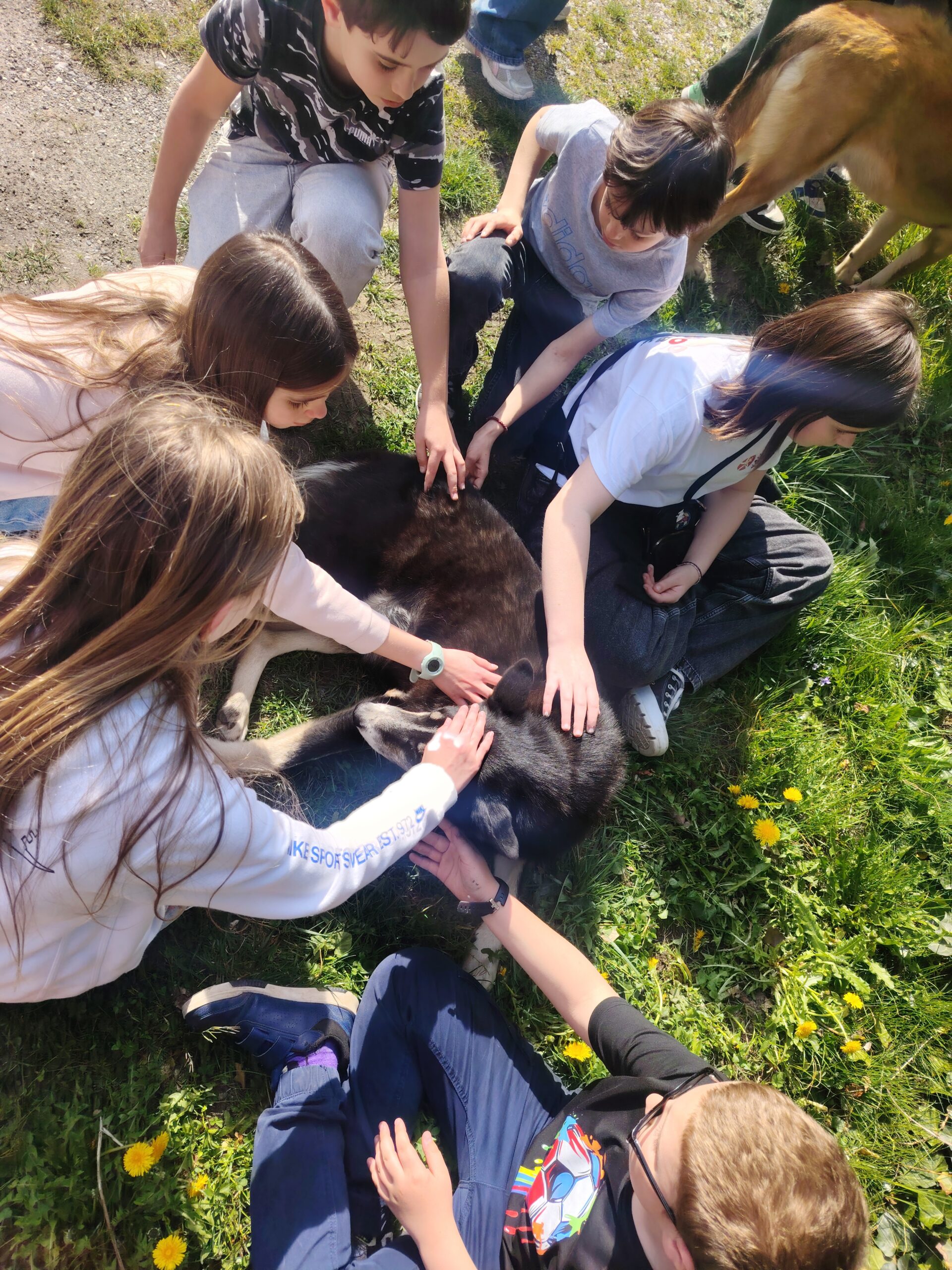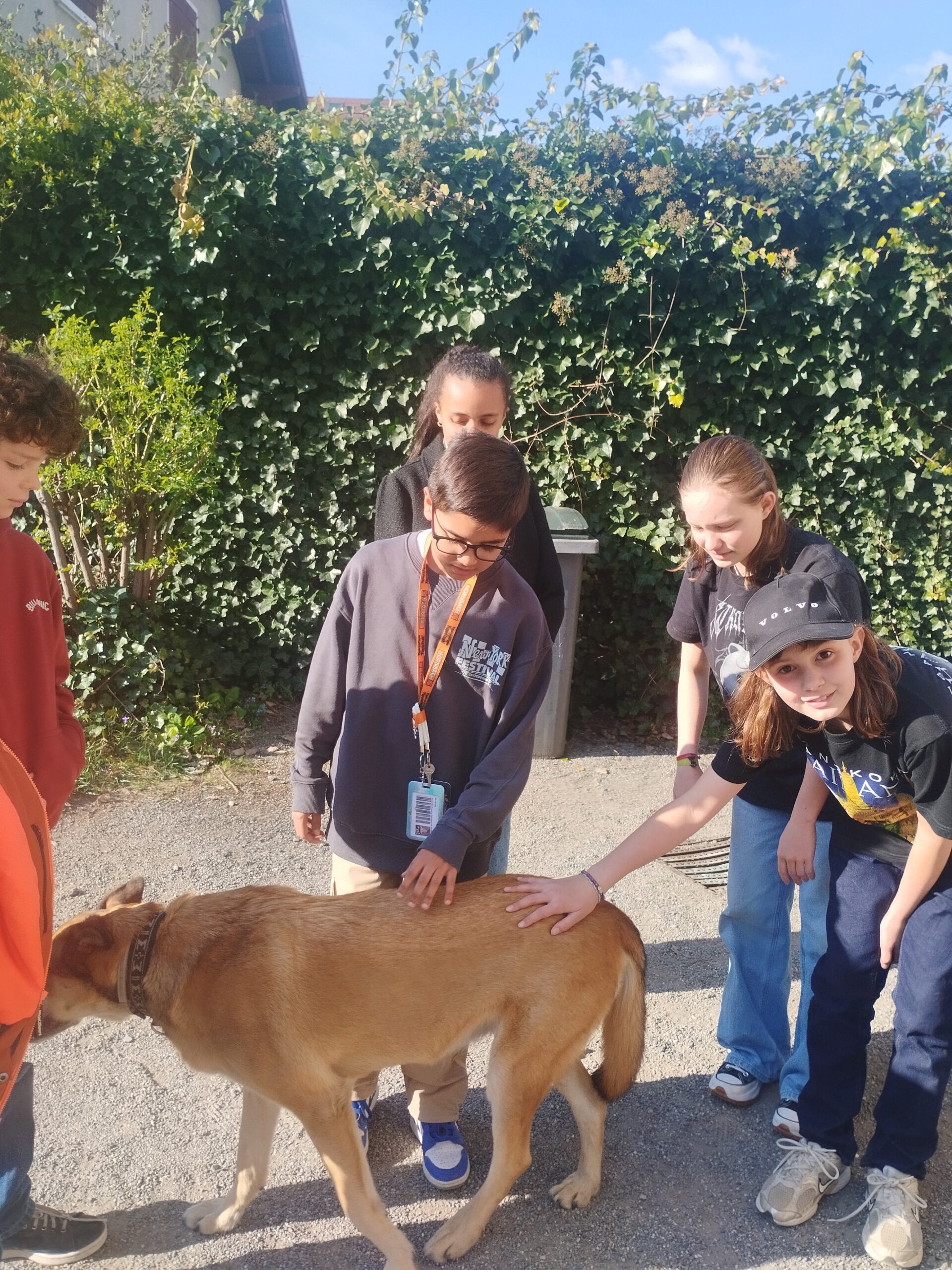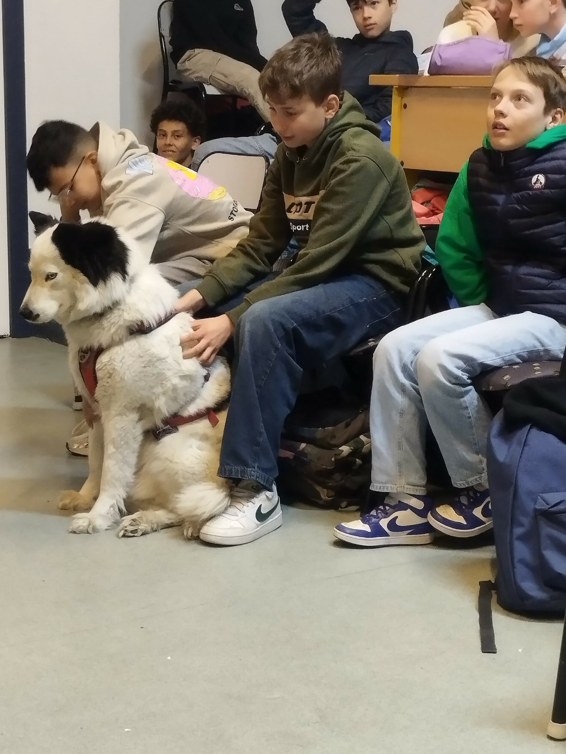 Moment fort de la journée : la rencontre avec « Petit Loup » et les autres chiens, qui a particulièrement marqué les élèves.