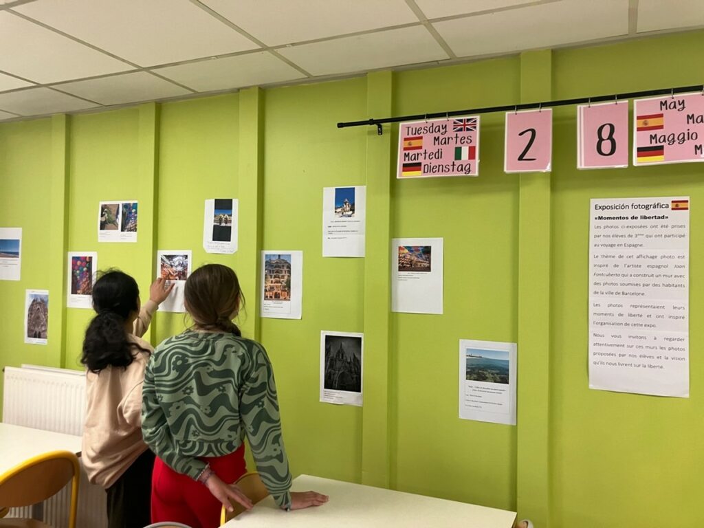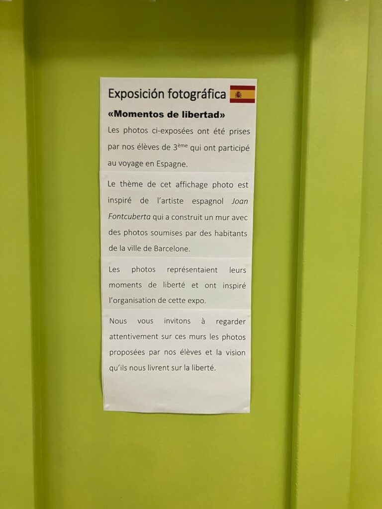 - Prise de photos “MOMENTOS DE LIBERTAD” (pendant leur voyage) pour organiser l’expo photographique dans la cantine du collège. Le thème de cet affichage photos est inspiré de l’artiste espagnol Joan Fontcuberta qui a construit un mur avec des photos soumises par des habitants de la ville de Barcelone. Les photos représentaient leurs moments de liberté et ont inspiré l’organisation de cette expo.