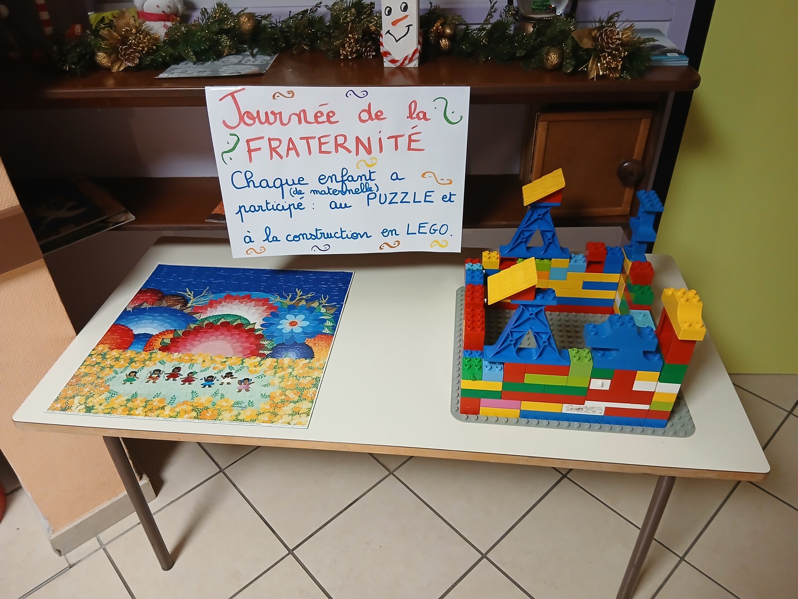 • Constructions collectives : les élèves ont collaboré autour de constructions communes, avec la réalisation d’une maison en légos et d’un puzzle de 120 pièces, favorisant l’entraide et le travail d’équipe.