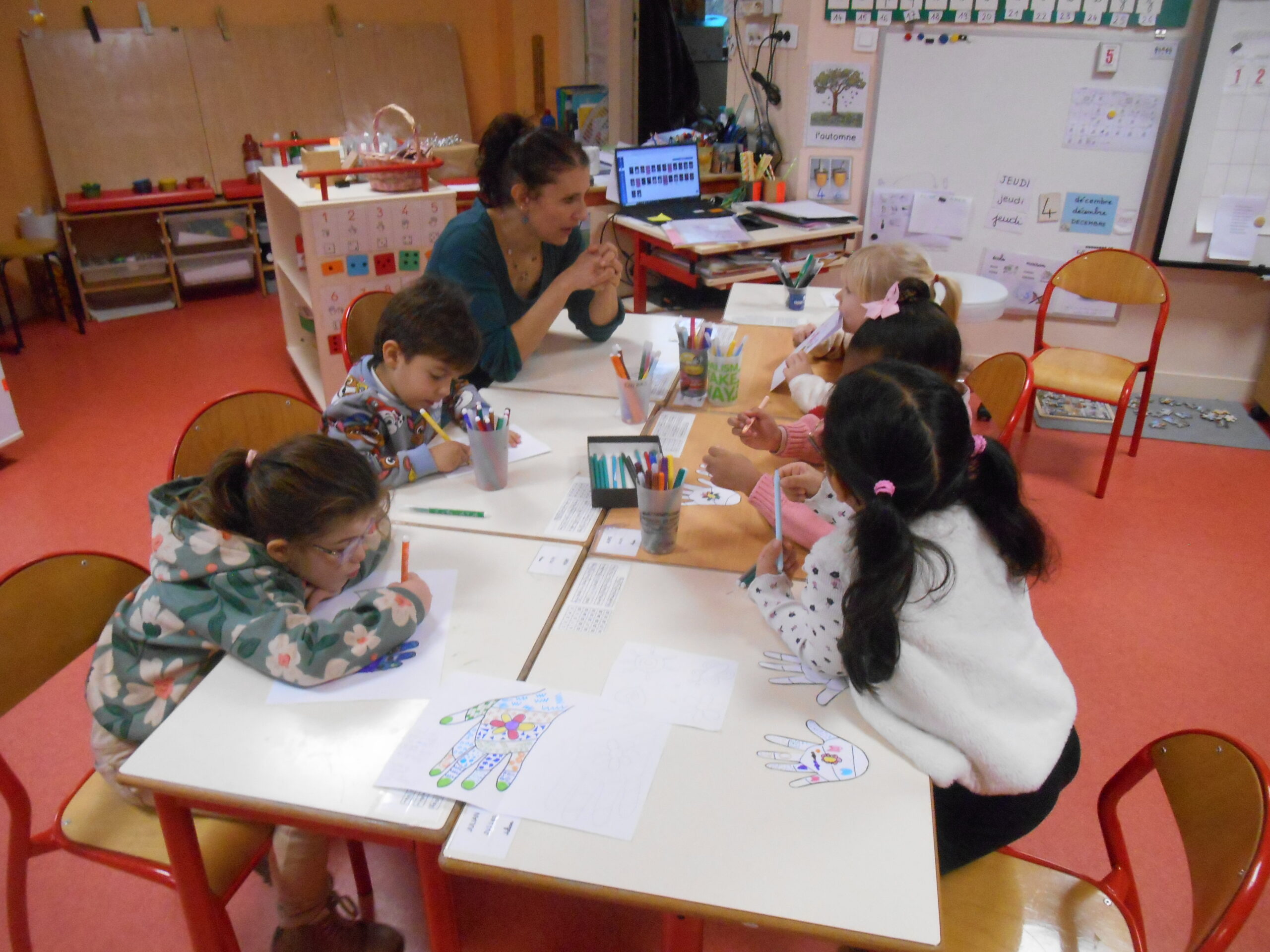 • Atelier arts plastiques : chaque enfant a réalisé la forme de ses mains afin de décorer un arbre collectif, symbole de fraternité. Craies grasses, papiers colorés, feutres, gommettes et plumes étaient mis à disposition, pour le plus grand plaisir des enfants.