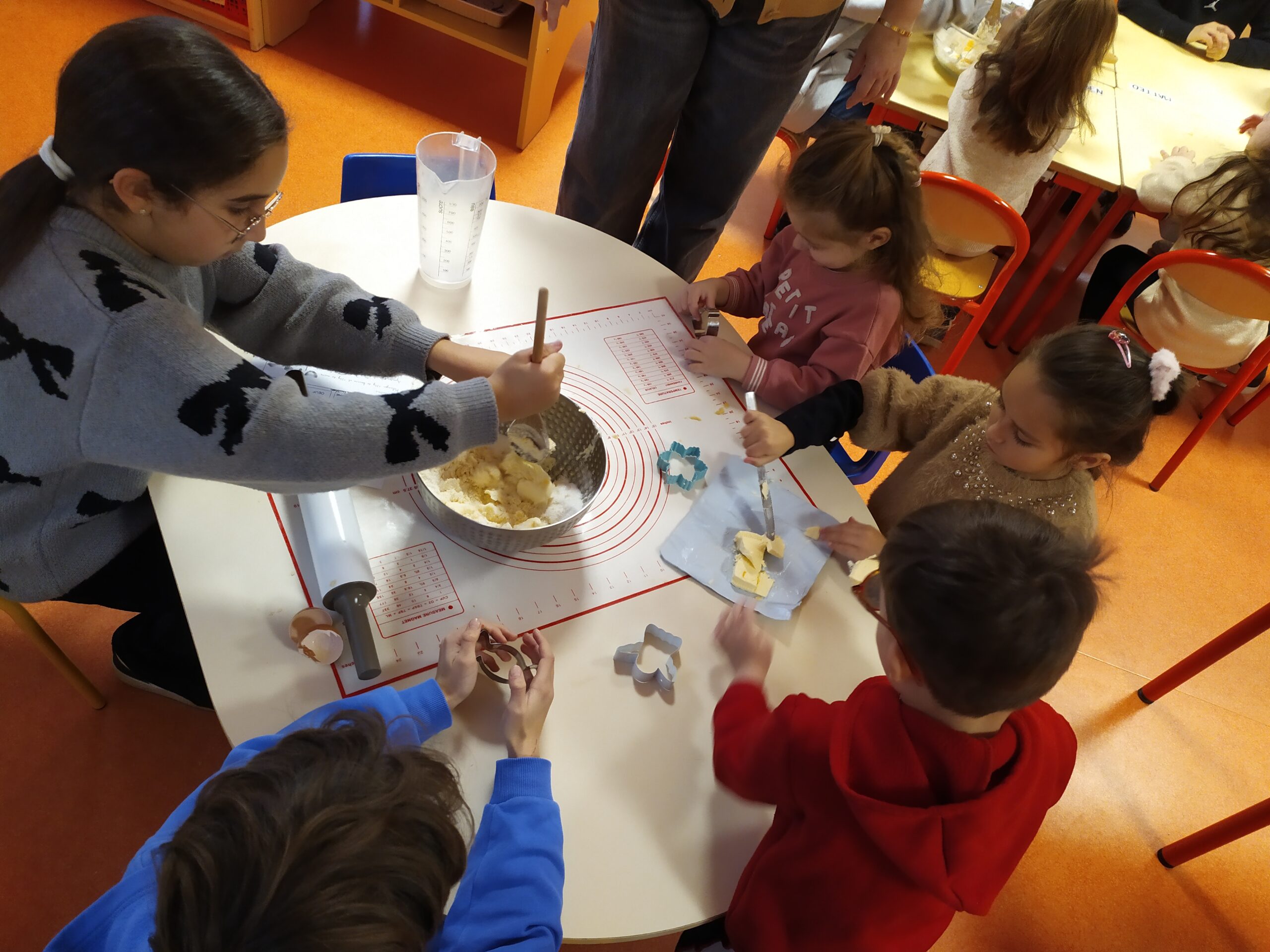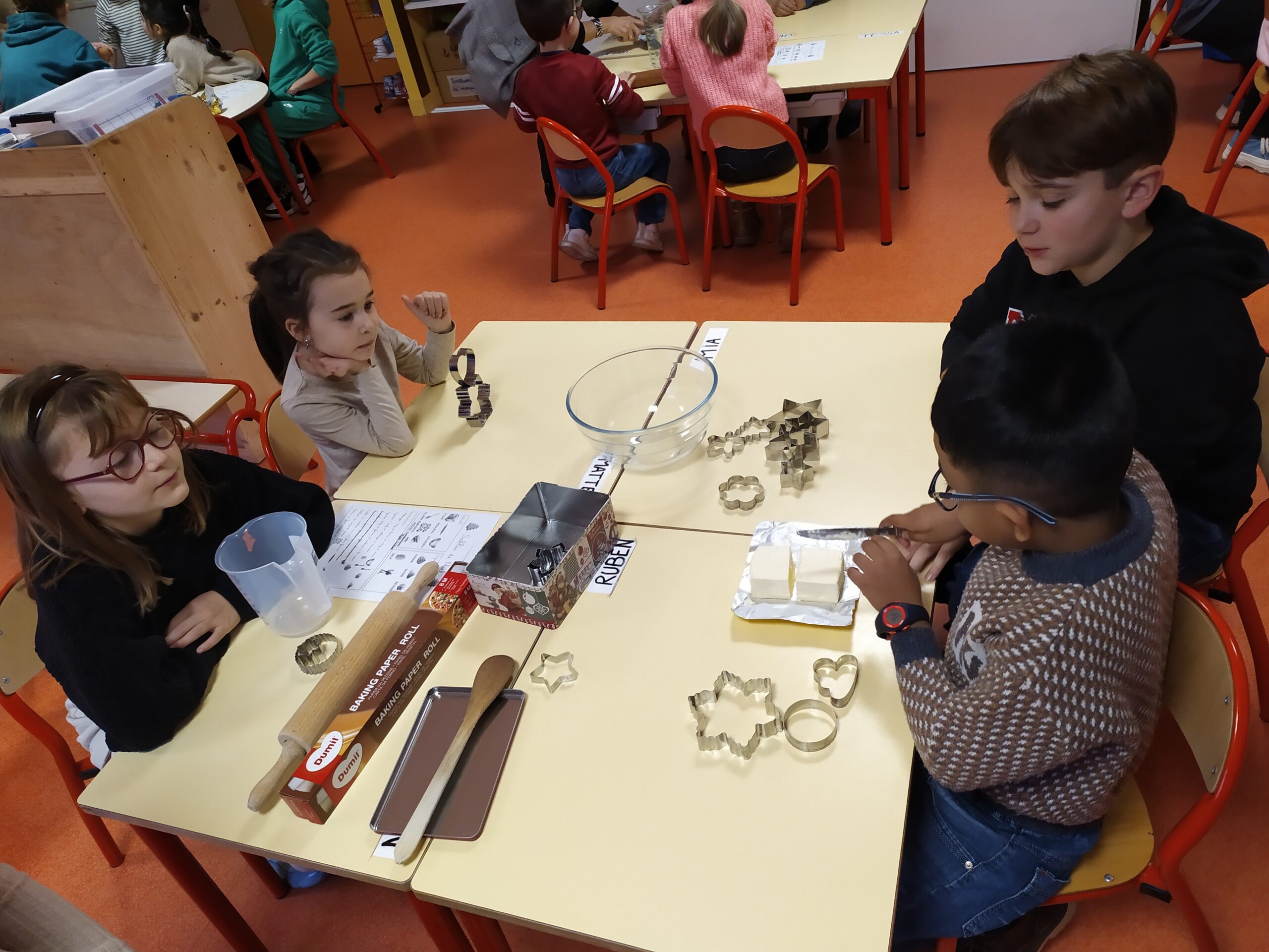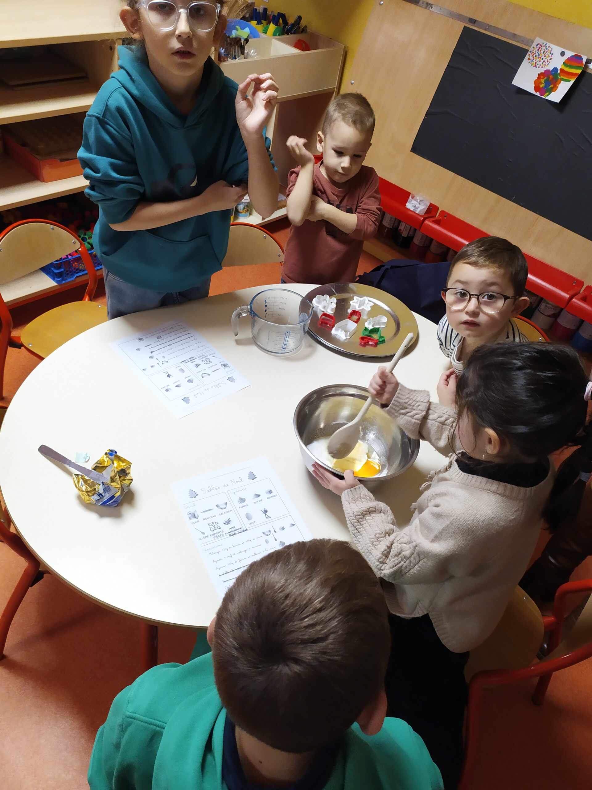 Au programme : cuisine et bricolage ! Certains binômes ont préparé de délicieux sablés, tandis qu’un autre groupe a créé de jolies guirlandes pour décorer la classe. Après un premier temps d’activités, les enfants ont inversé les rôles afin que tous puissent expérimenter l’ensemble des ateliers.