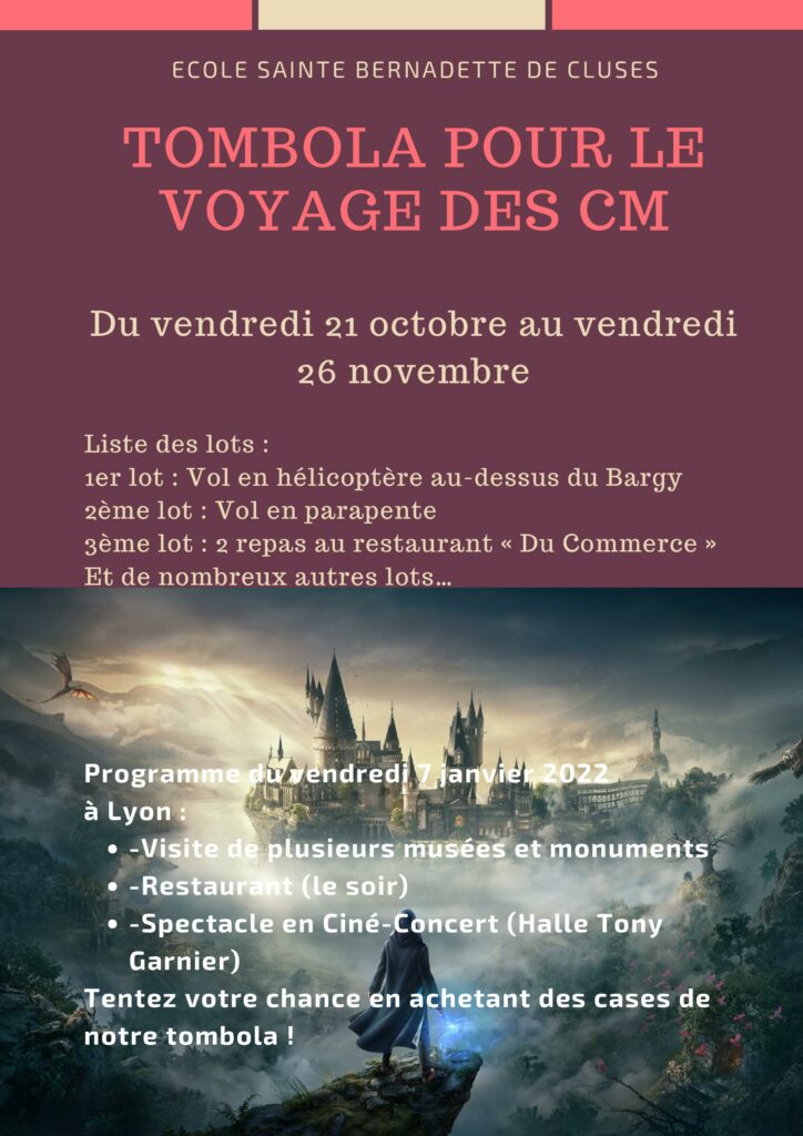 Les 4 classes de CM de l’école Sainte Bernadette organisent une grande tombola pour financer leurs différentes sorties. N’hésitez pas à tenter votre chance !