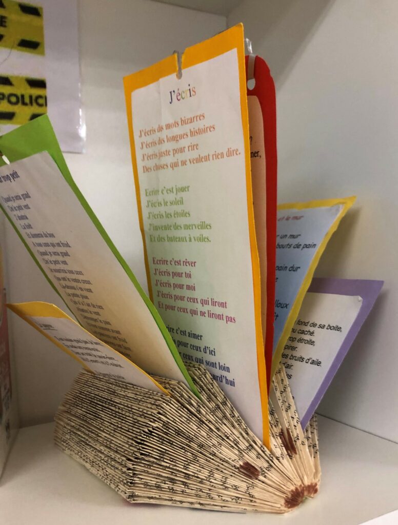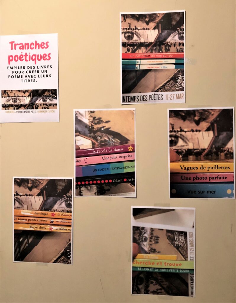 Les élèves pourront piocher des poèmes sur l’arbre à poèmes et devenir souffleurs de poèmes, découvrir le fond poésie mis en valeur pour l’occasion, empiler des livres pour créer un poème avec leurs titres, acrostiches pour les CM avec le mot Frontières thème du printemps des poètes 2023.