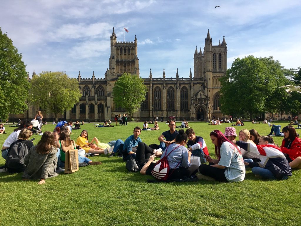 • Pique-nique dans le jardin de l’Université de Bristol, mélange aux étudiants