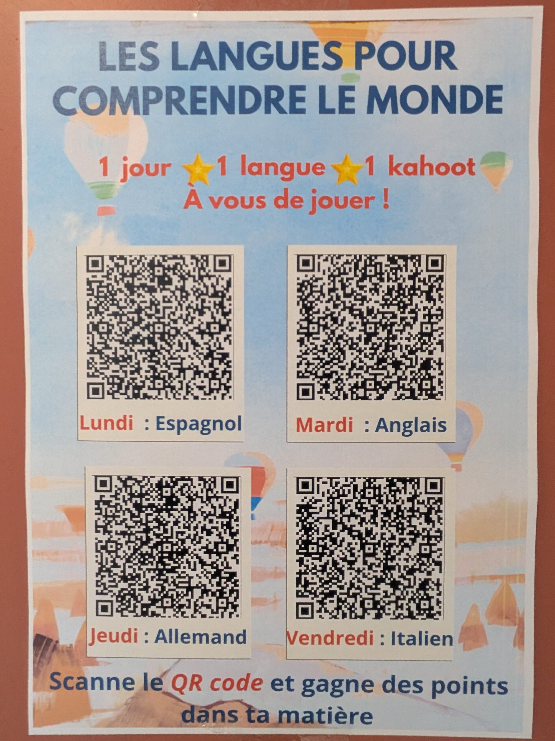 - Des quiz interactifs (Kahoot), conçus par Laura Quintero avec ses élèves, étaient également proposés pour chaque langue. Accessibles via QR codes, ils ont permis de tester ses connaissances de manière ludique.