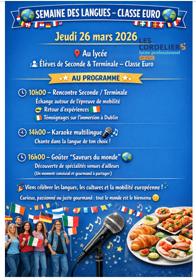 Du 23 au 27 mars, le collège et lycée Saint Jean Bosco ainsi que le lycée professionnel Les Cordeliers ont célébré la Semaine des Langues, un temps fort national dédié à la diversité linguistique, à l’ouverture culturelle et à la mobilité européenne.