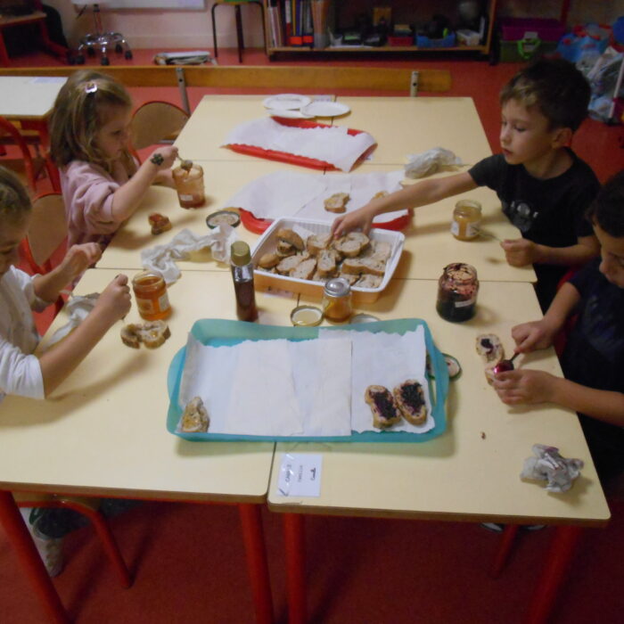 Lundi 24 novembre, la classe de CMd de maîtresse Clara est venue partager un délicieux petit-déjeuner avec les maternelles des classes Pivoine et Orchidée. Au menu : de belles tartines