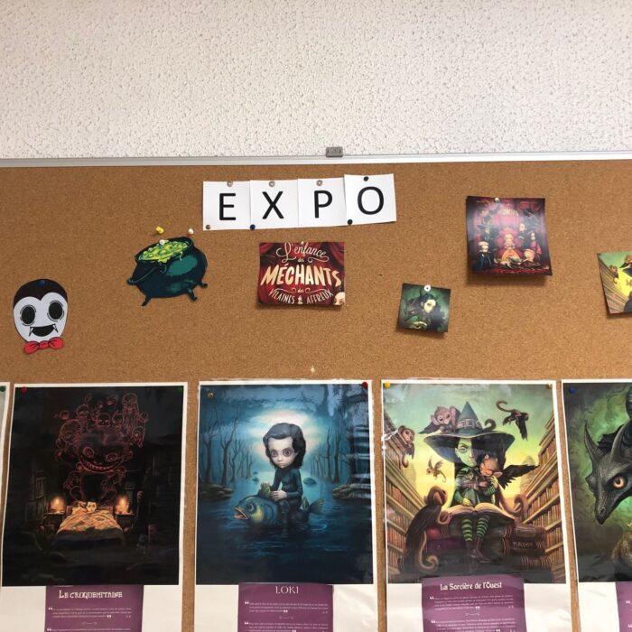 Depuis mardi 14 octobre, la BCD de l’école Sainte Bernadette se transforme pour Halloween avec une décoration spéciale et une exposition captivante : « L’enfance des méchants, des vilaines et des